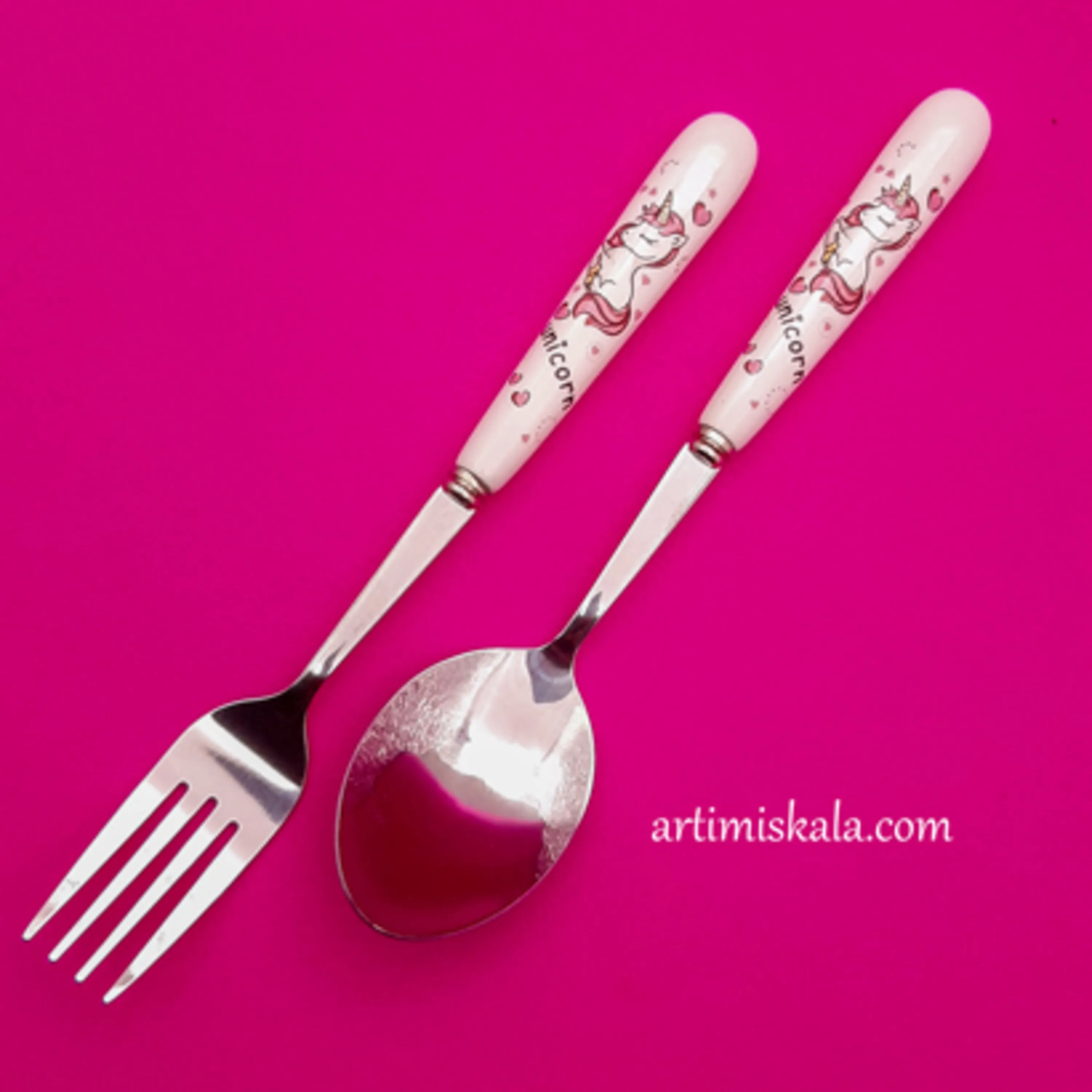 ست قاشق و چنگالدخترانه یونیکورن ساخته شده از استیل که به هیچ عنوان زنگ نمی زند دسته آن از جنس سرامیک ساخته شده که طرح بسیار زیبای اسب های تک شاخ بر روی آن نقش بسته است.