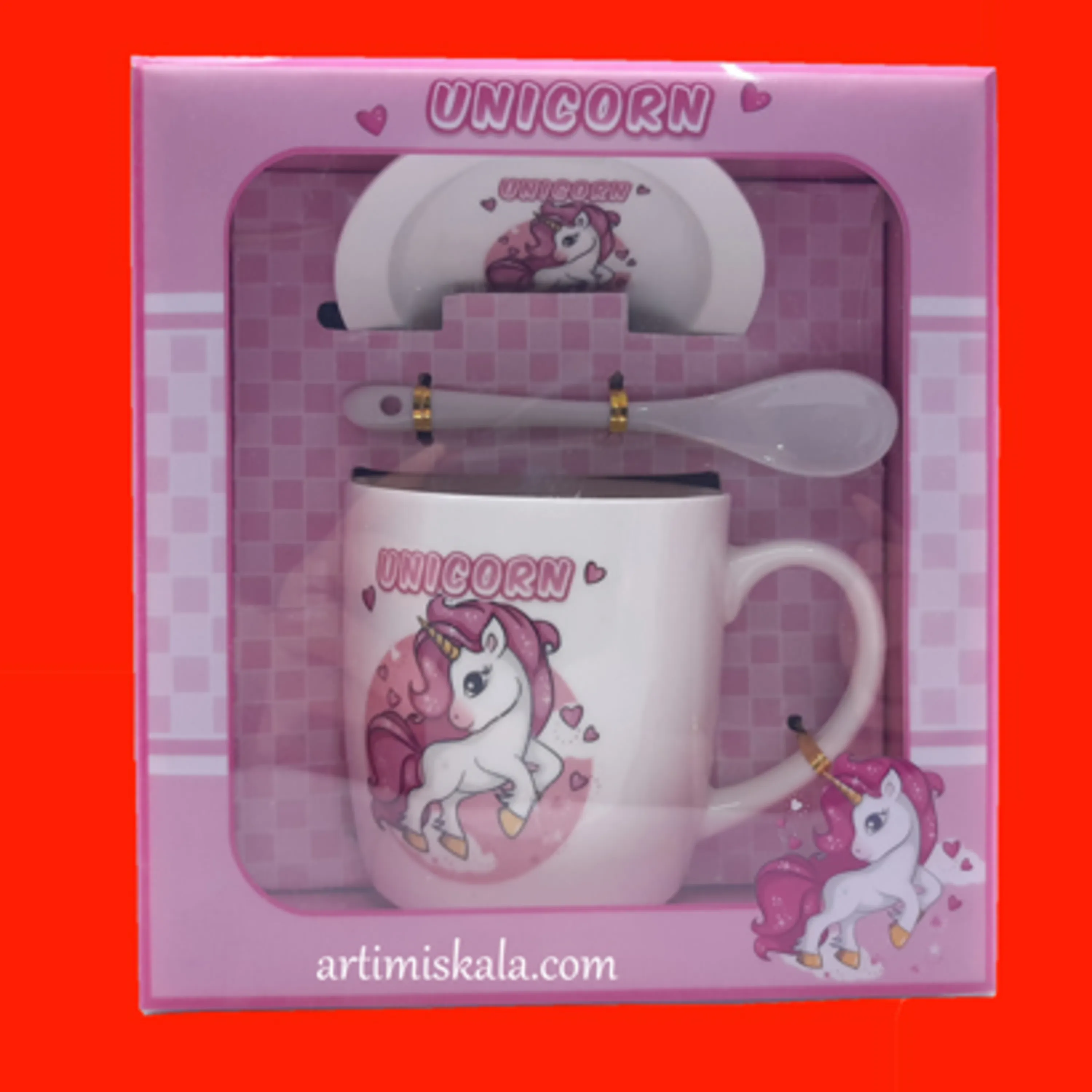 این ست شامل یک عدد لیوان دسته دار با طرح زیبای اسب تک شاخ و یک عدد قاسق کوچک و یک عدد زیر لیوانی که میتوان در زمان استفاده برای دمنوش بر روی لیوان ( درب ) قرار گیرد .