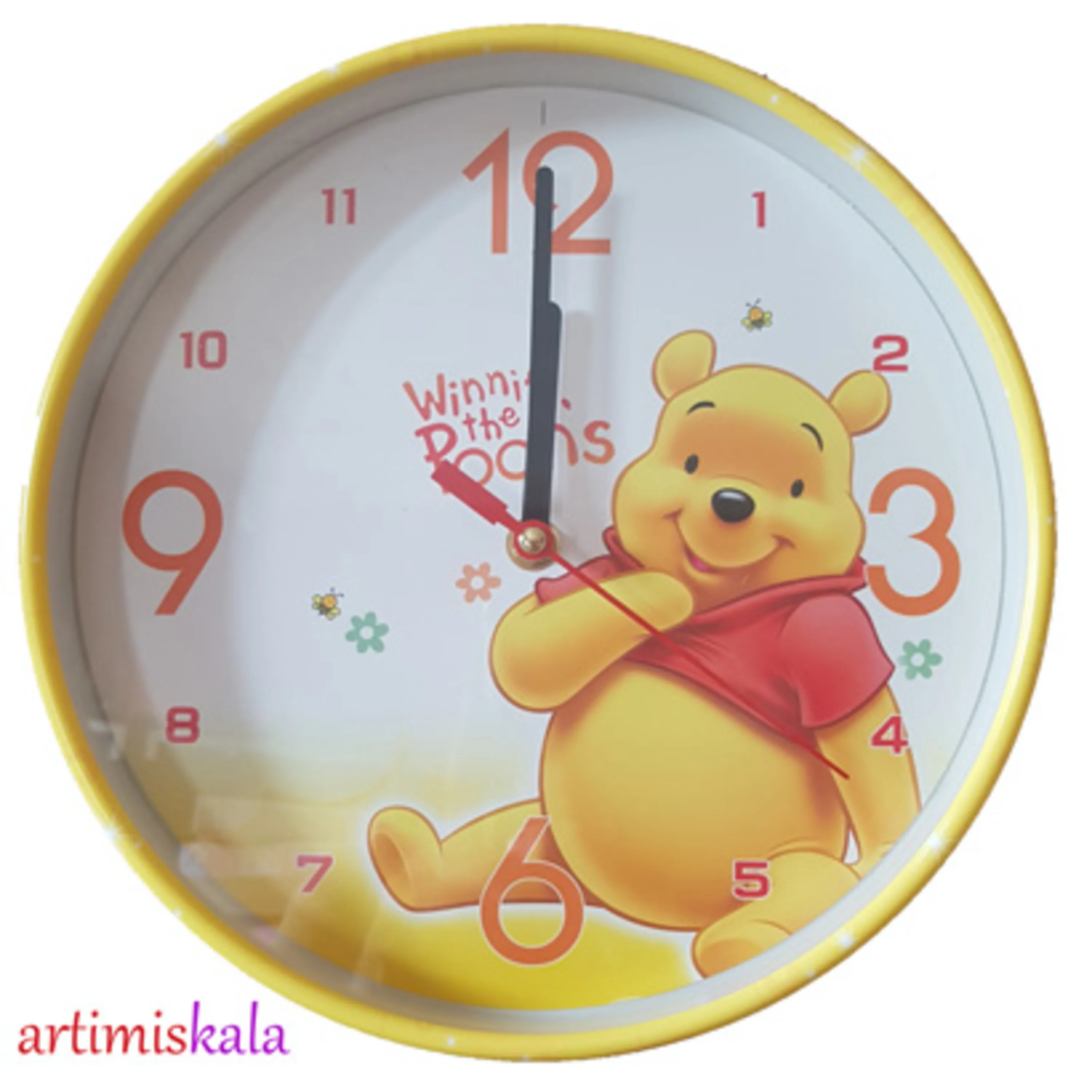 داخل صفحه ساعت دیواری از طرح زیبای شخصیت دوست داشتنی خرس پو استفاده شده است و قاب دور ساعت به رنگ زرد با طرح خرس پو تزیین شده است