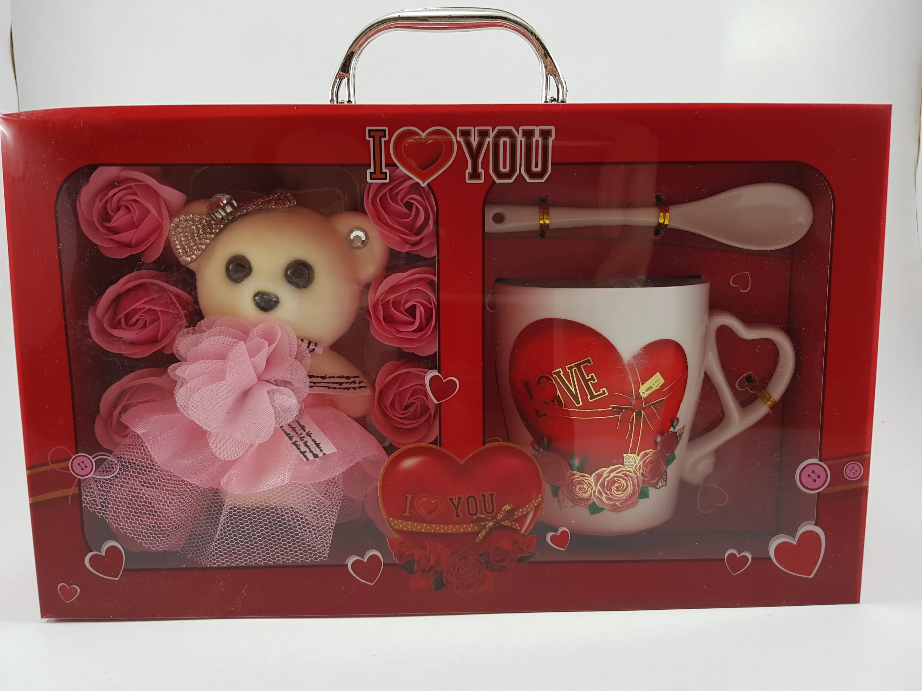 بسته بندی بسیار زیبا و شیکی به رنگ قرمز دارد، محتویات داخل جعبه شامل یک عدد عروسک خرس کوچک و یک عدد ماگ سرامیکی همراه با قاشق مربوطه و تعداد هشت عدد غنچه گل رز است که به صورت زیبایی درون جعبه قرار داده شده است.
